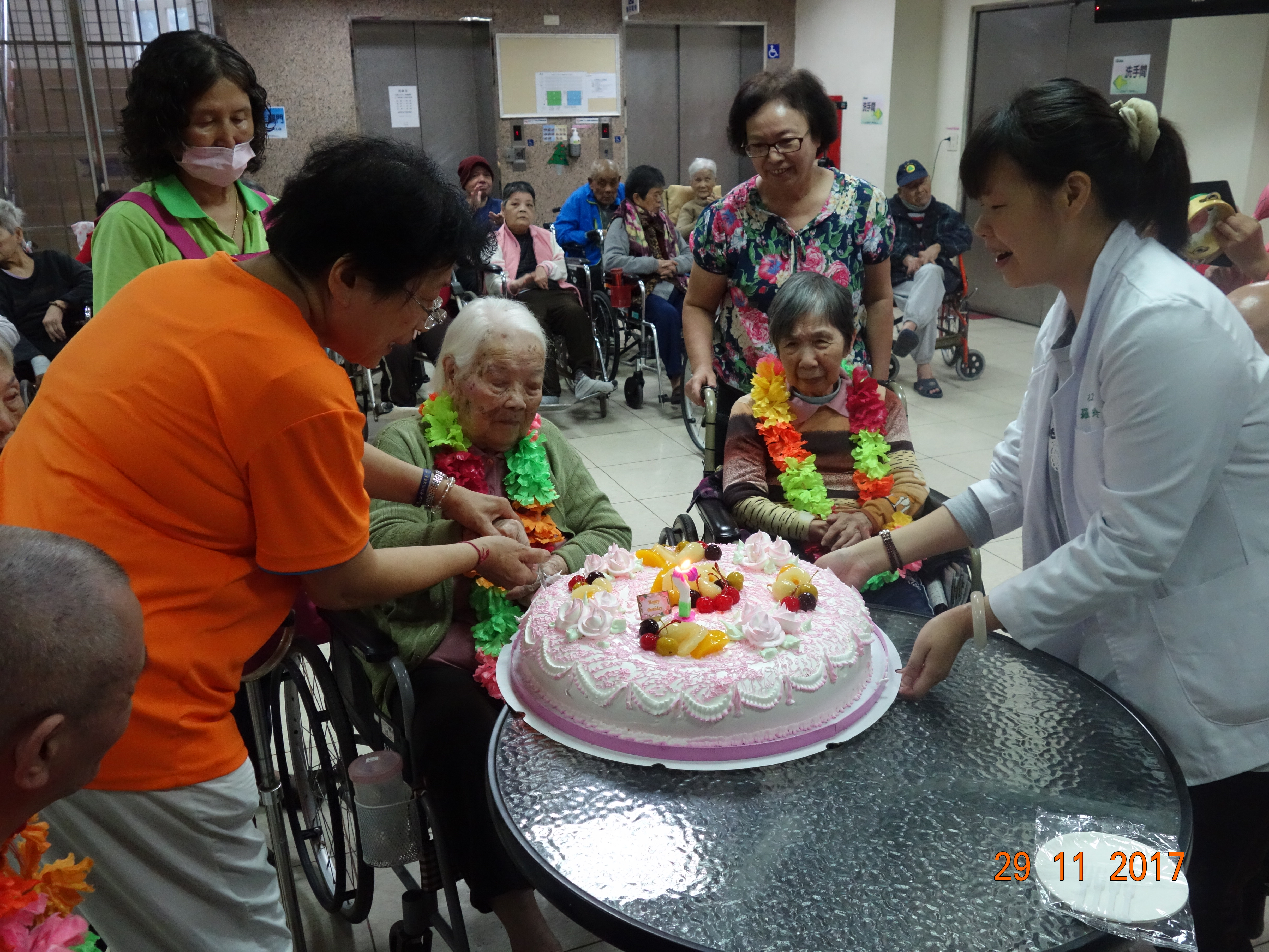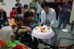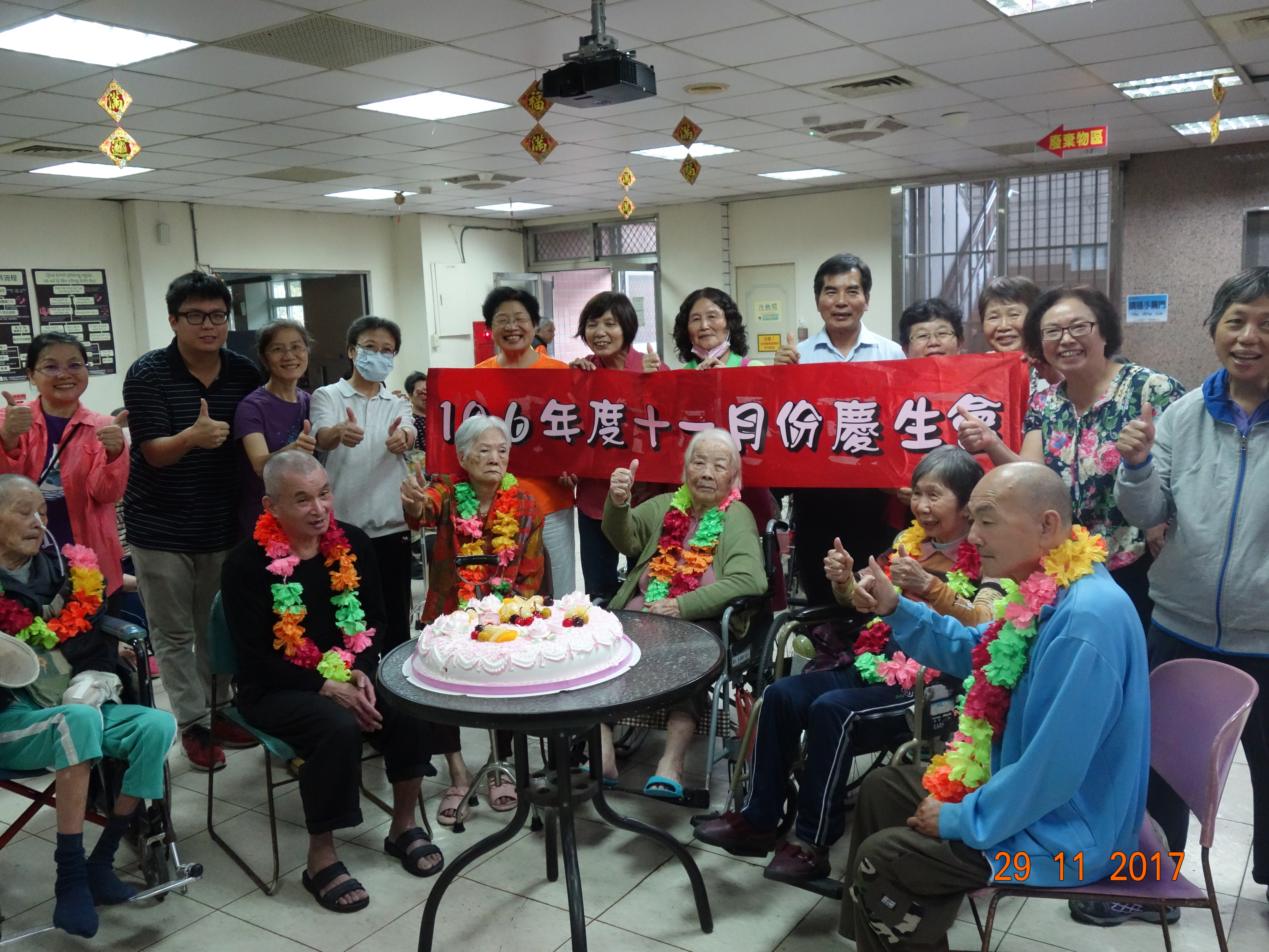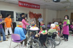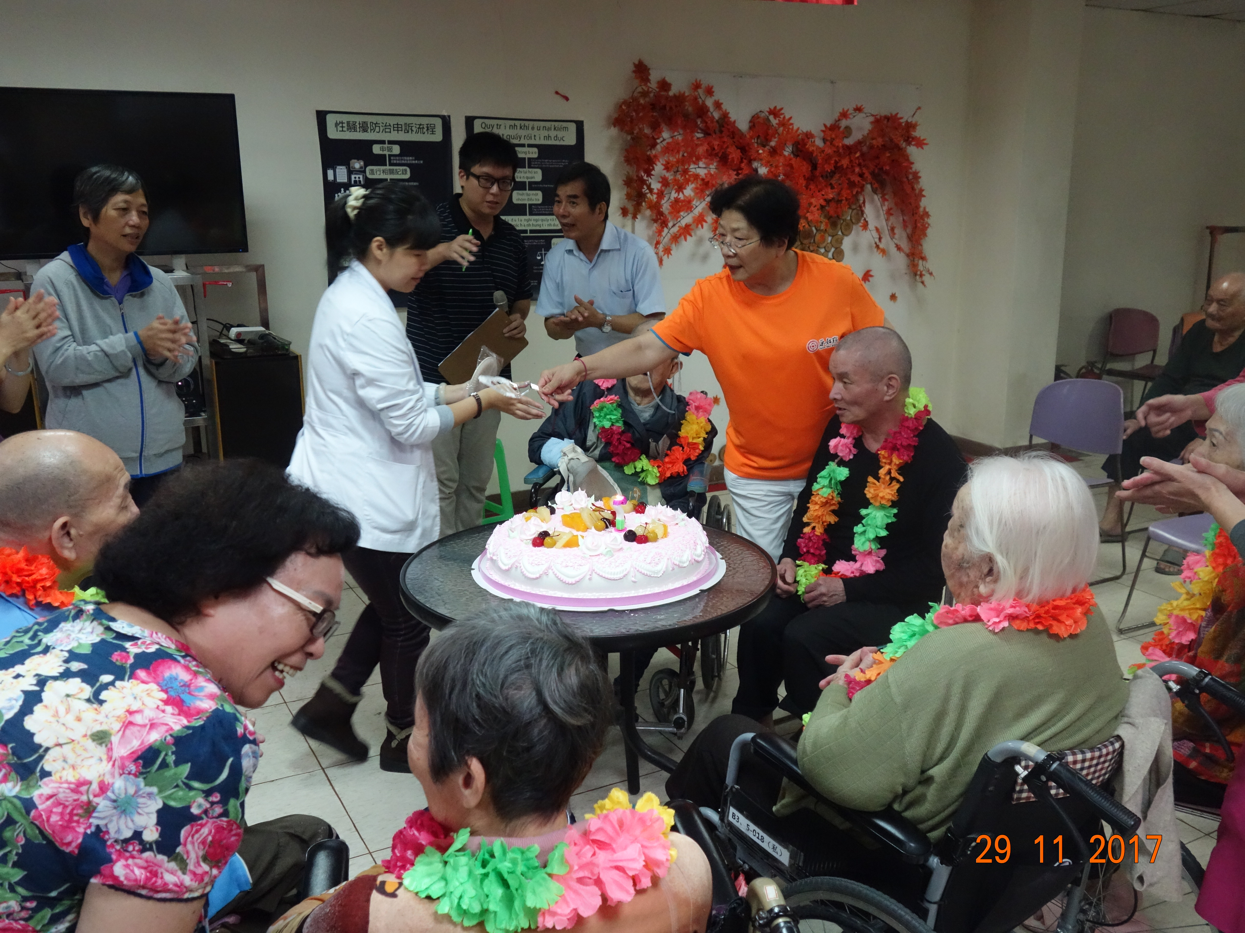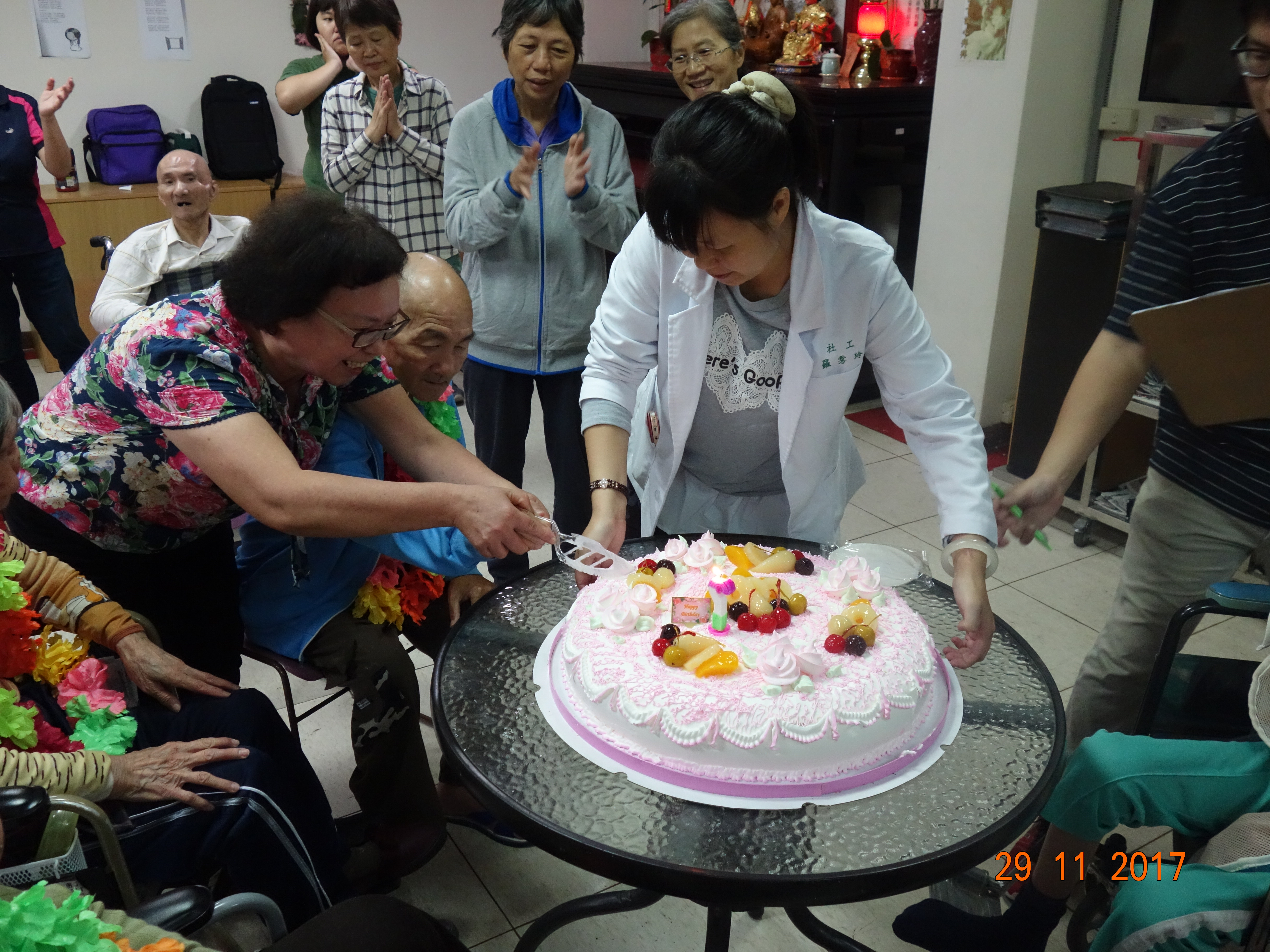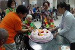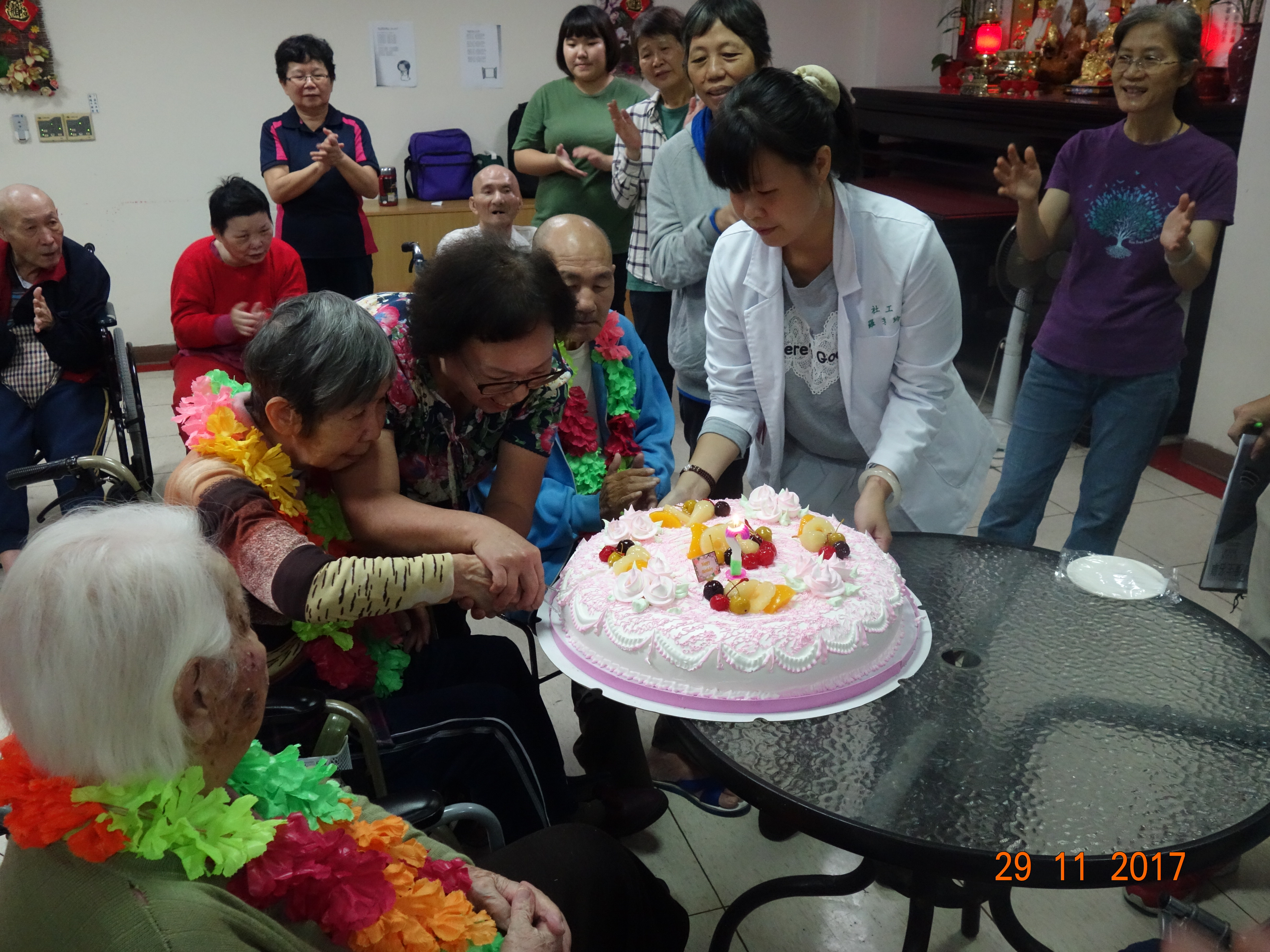 接下來是慶生會時間,由社工昱廷主持邀請里仁福智志工隊一起為十一月份壽星長輩切蛋糕和拍照,活動結束後長輩們面待微笑,回去樓層享用美味的午餐,而志工們及住民最後拍一張團體照,活動順利圓滿結束。