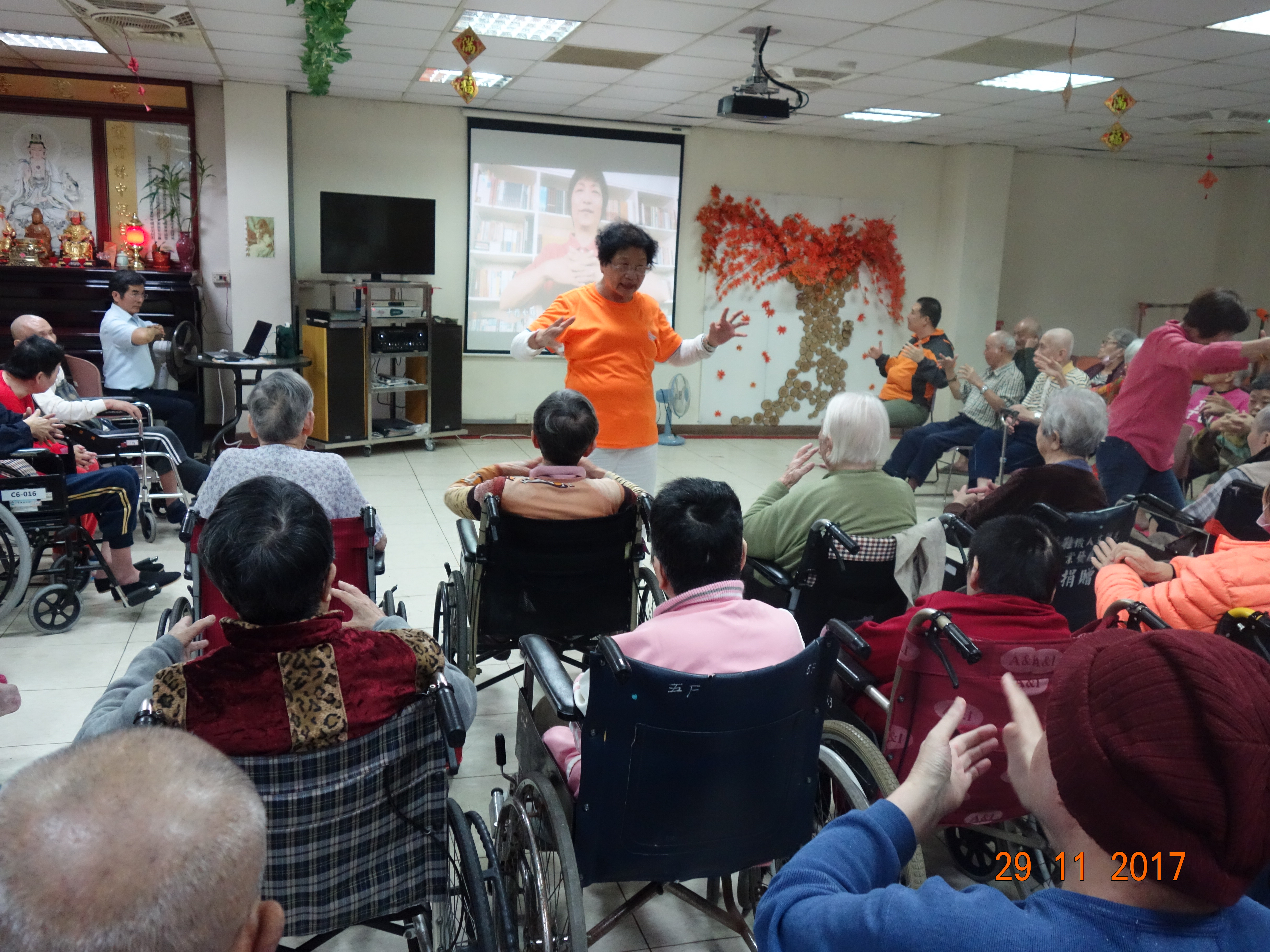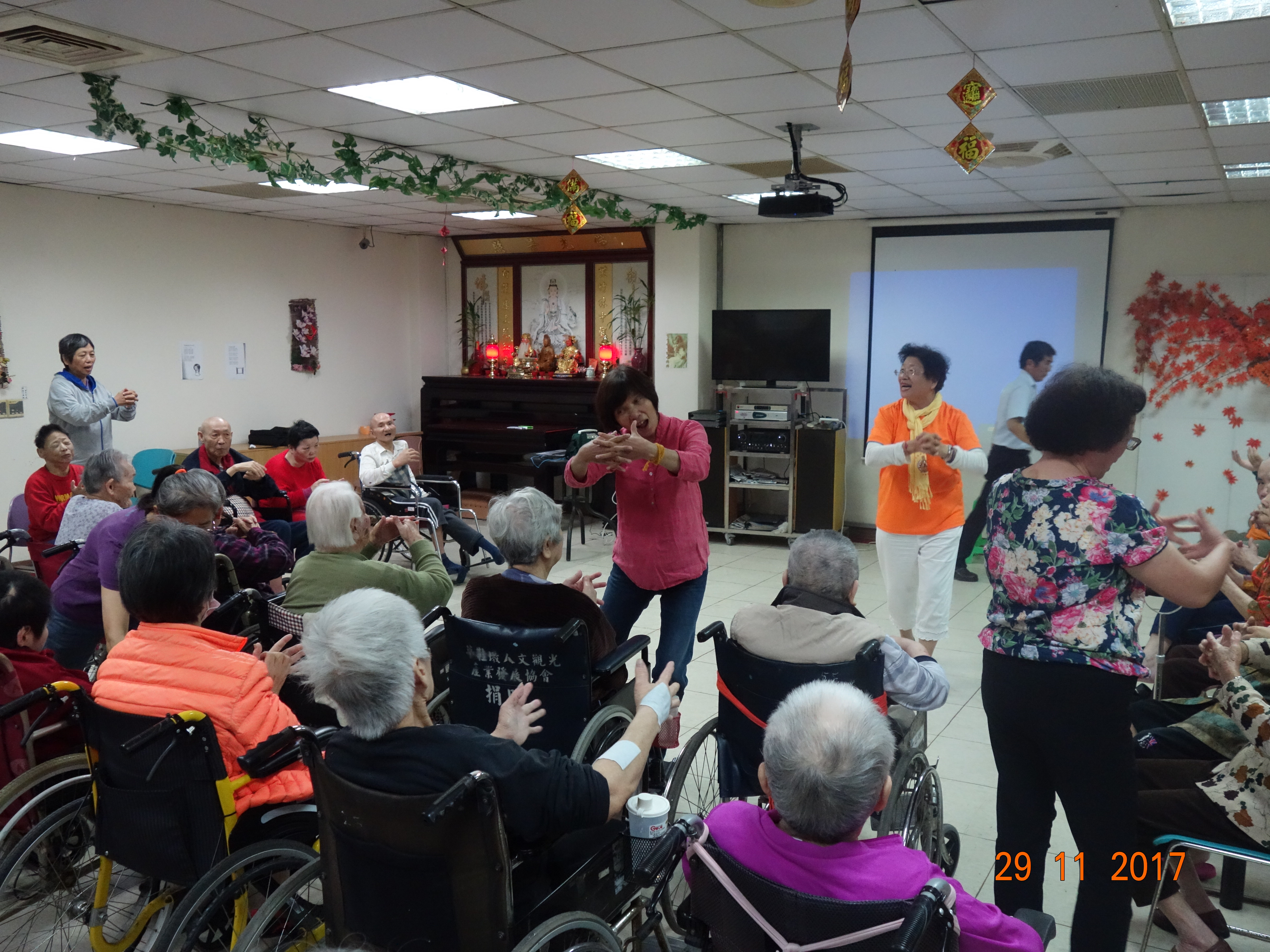 首先由福智里仁志工的余麗美班長活動開場,接下來的節目是有氧健康操活動,由志工隊帶來教學影片,透過教學影片的健康操動作,能夠促進長輩在早晨時紓壓心情,且也能夠促進長輩體內血液循環,志工隊透過影片教學示範,並跟著音樂節奏的旋律,展現熱情的做操動作,除了健康操之外,也進行宗教關懷活動,教導長輩們多念佛號祈禱,促進長輩身心靈平穩,來保佑長輩身體健康、平安。