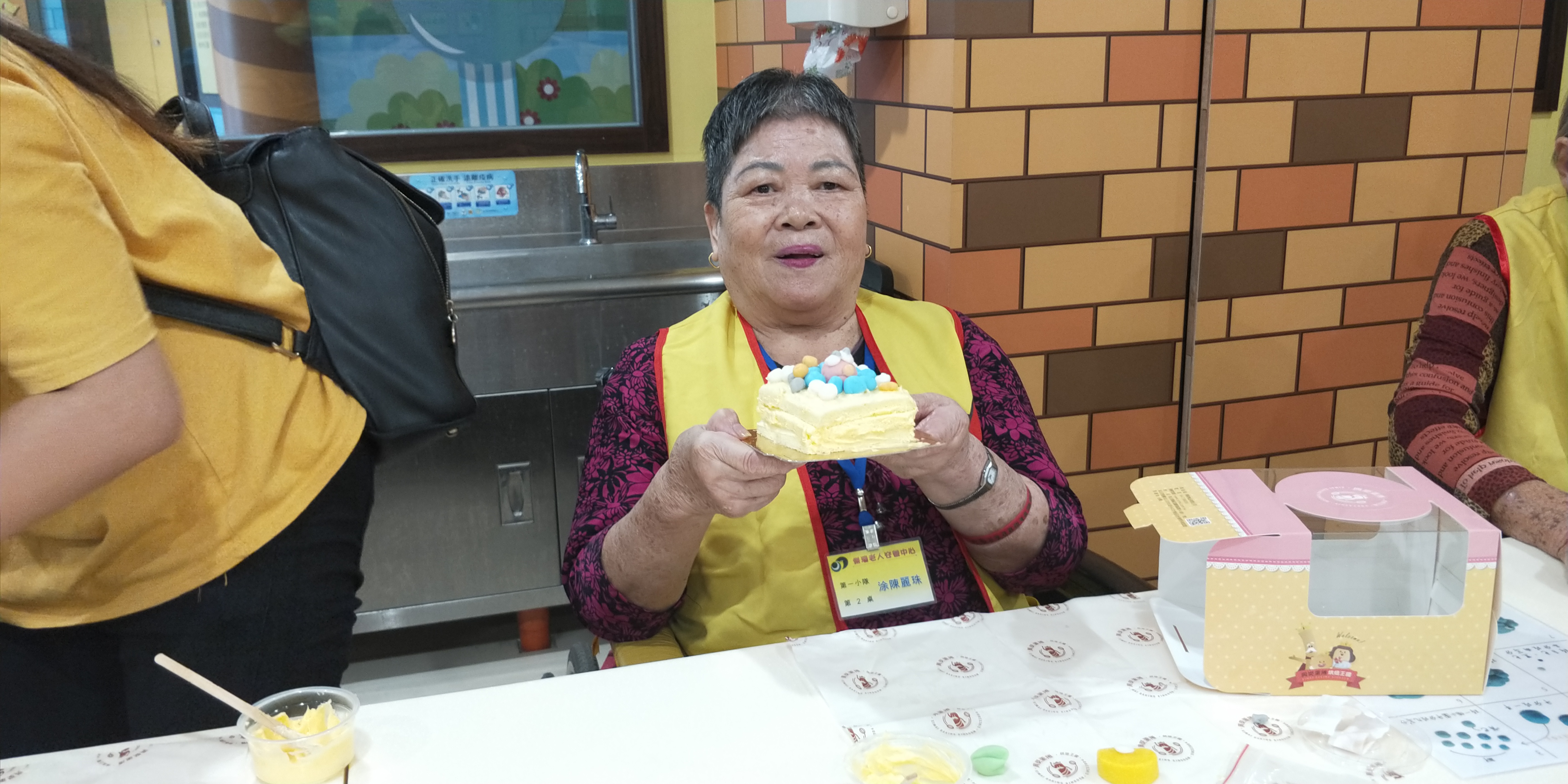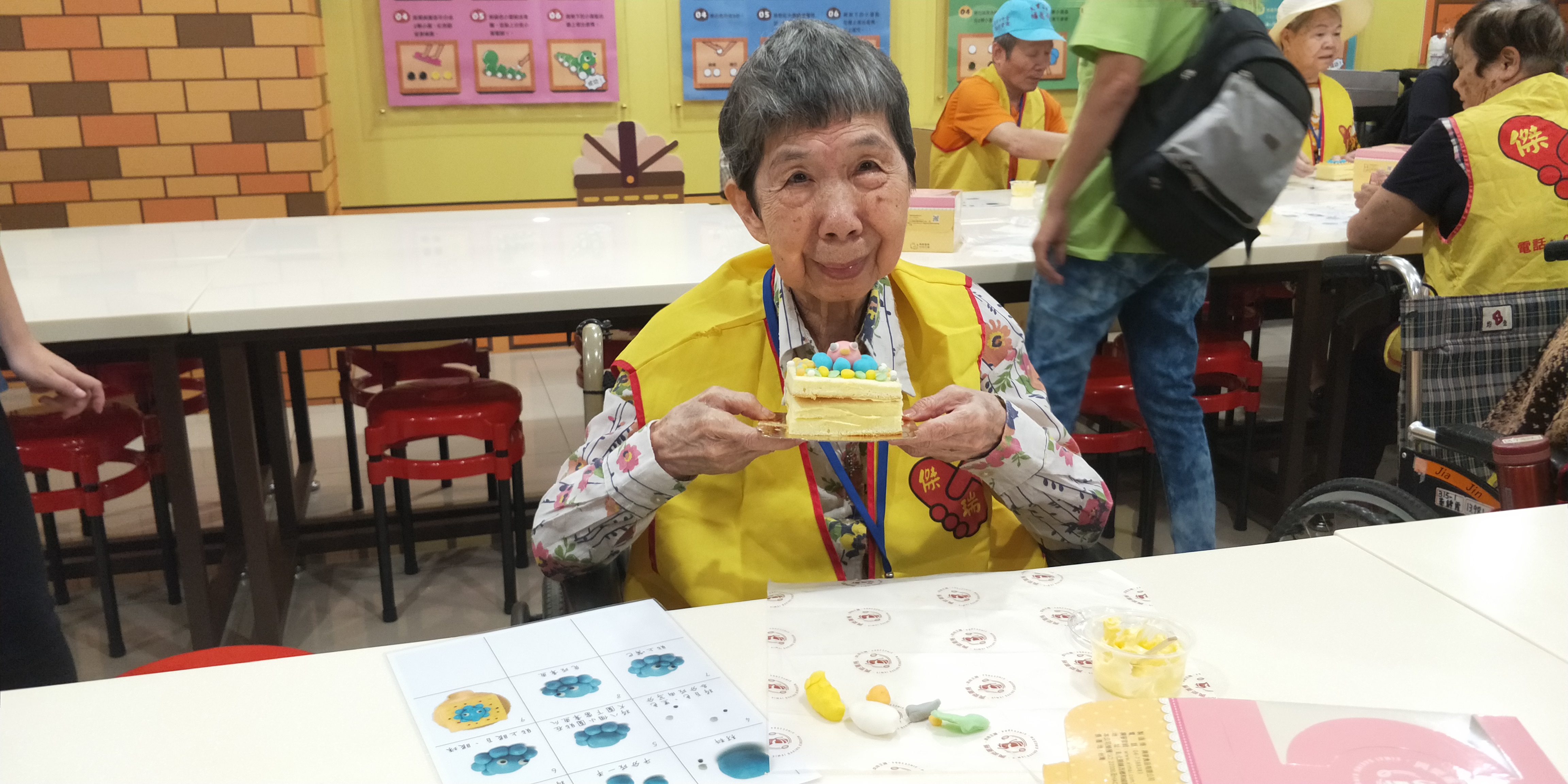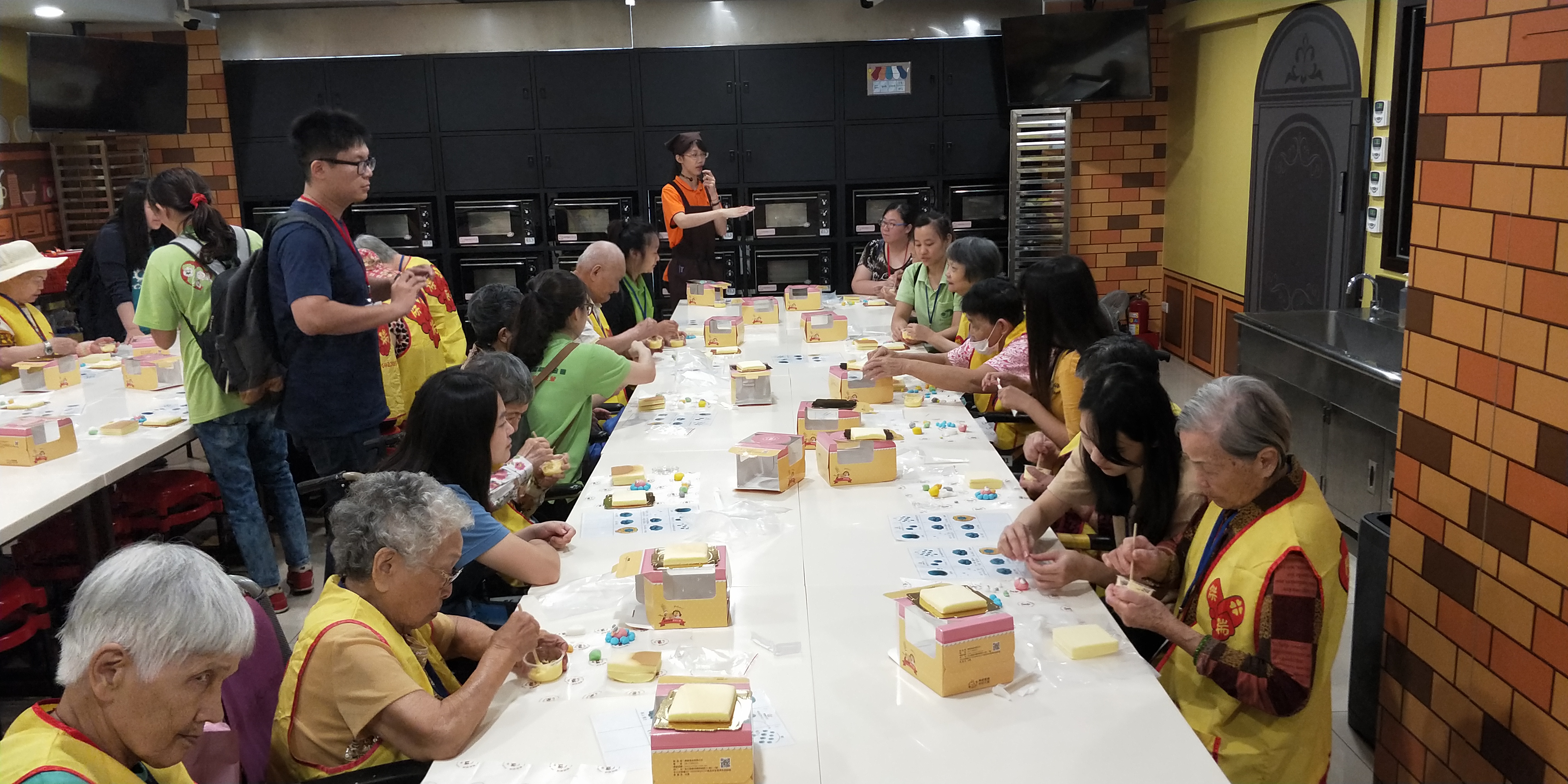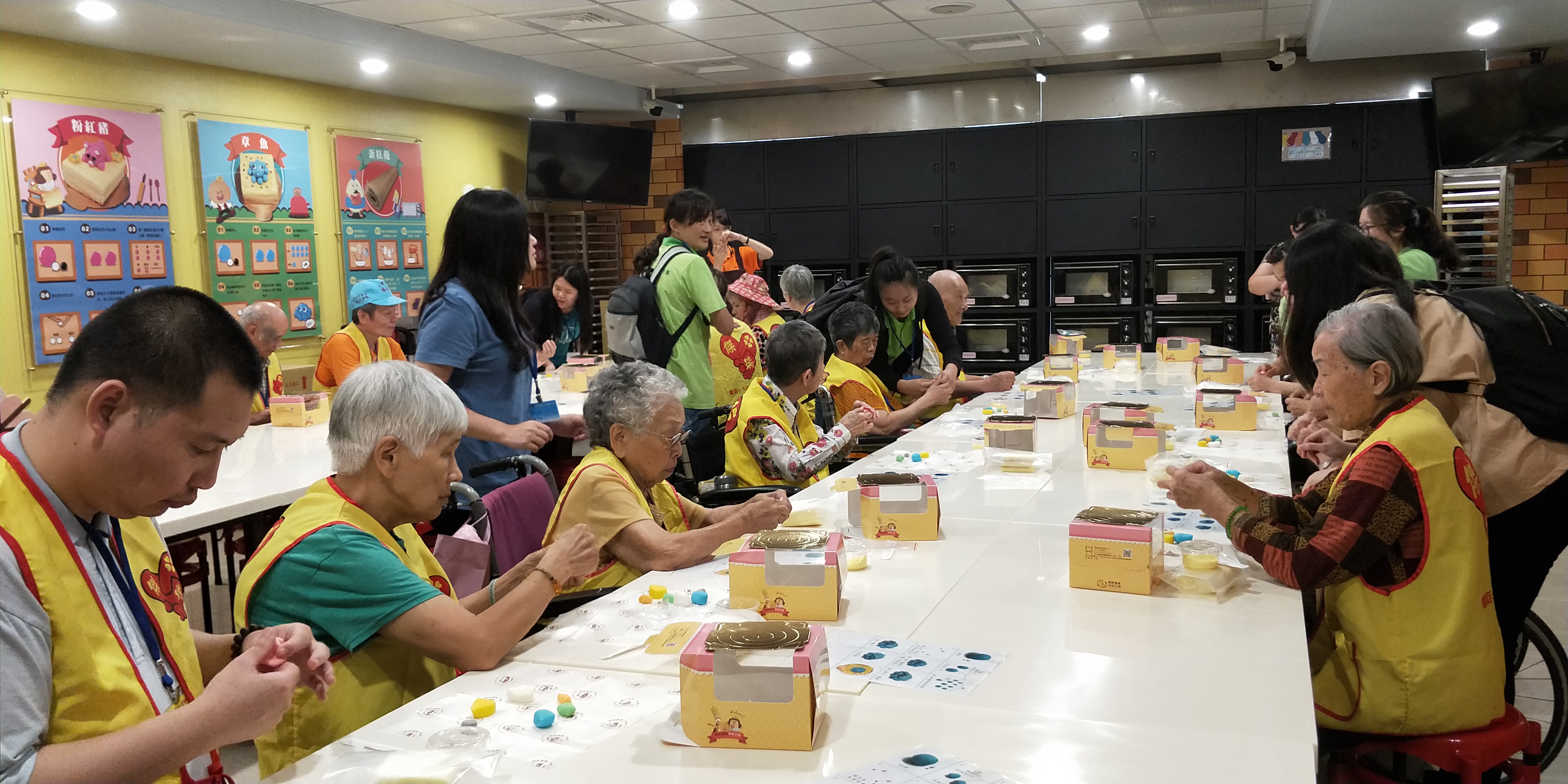 第一站到達興麥蛋捲工廠,大家下車由工作人員協助上廁所,接下來由廠方的導覽人員很熱情的為我們講解服務,工廠的內部設計及裝潢布置成童話故事般的風格,讓長輩及工作人員們忍不住停留下來拍照留念。接下來的重頭戲就是好吃又好玩的翻糖蛋糕,自行現場DIY和包裝,現場有導覽人員指導,翻糖就像捏麵人的黏土一樣,可以依照自己的喜好捏塑各式各樣的造型,裝飾在正方形蛋糕上,自己再塗上奶油加以陪襯,成為完美的DIY蛋糕作品。蛋捲工廠真的很貼心,提供精美的蛋糕包裝盒讓長輩方便攜帶回去好好享用。離開前,工作人員及住民搶購買五盒送一盒的蛋捲產品,總共買了一大箱,戰利品滿滿滿。