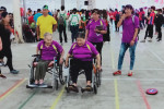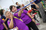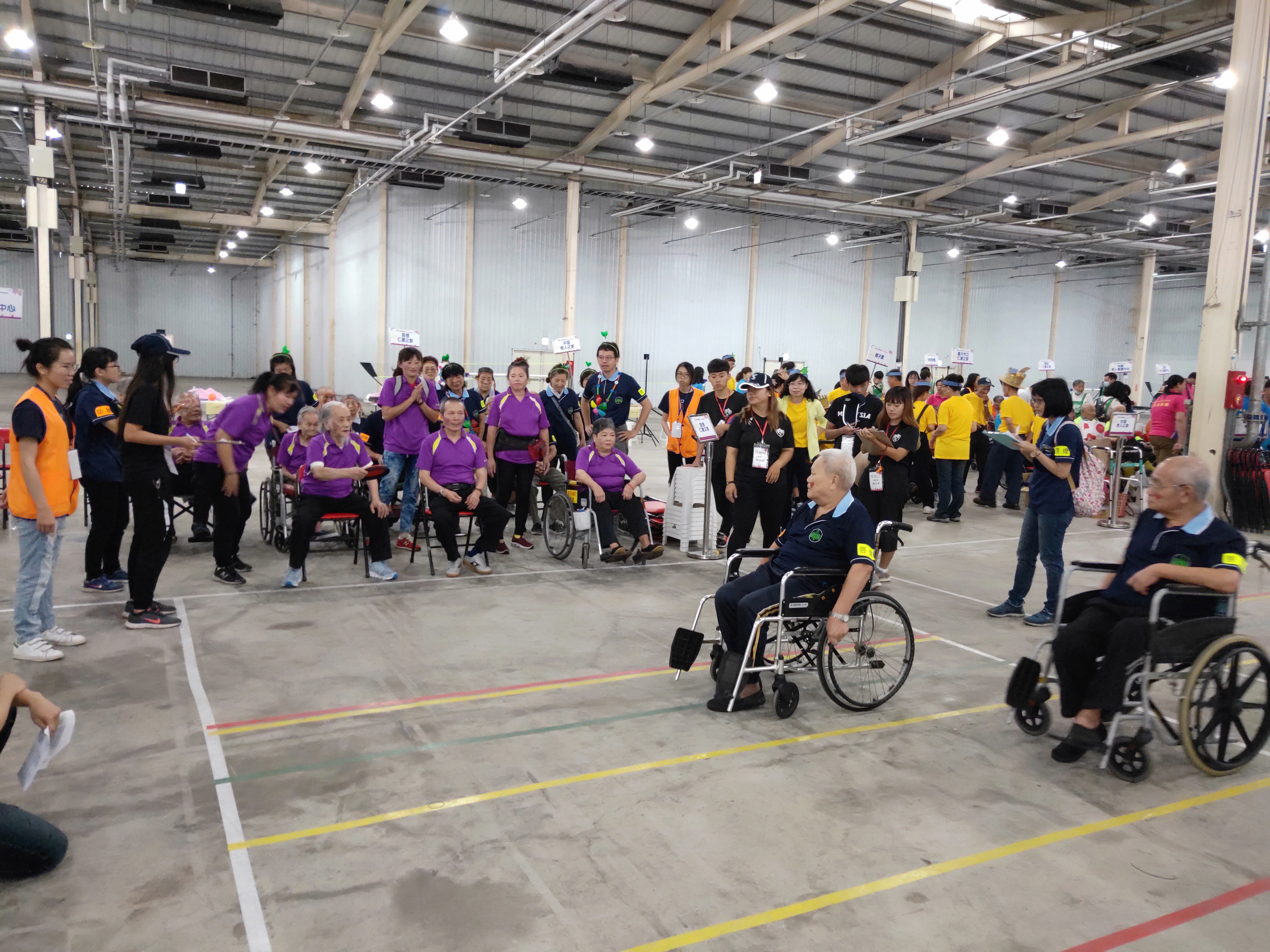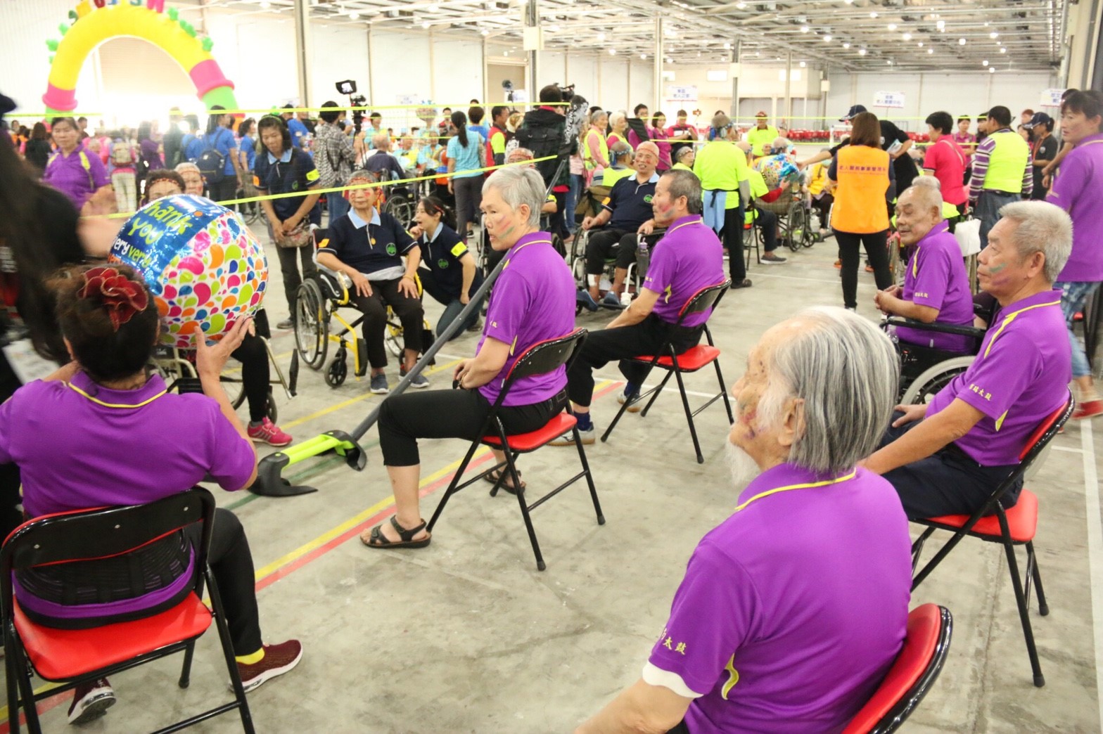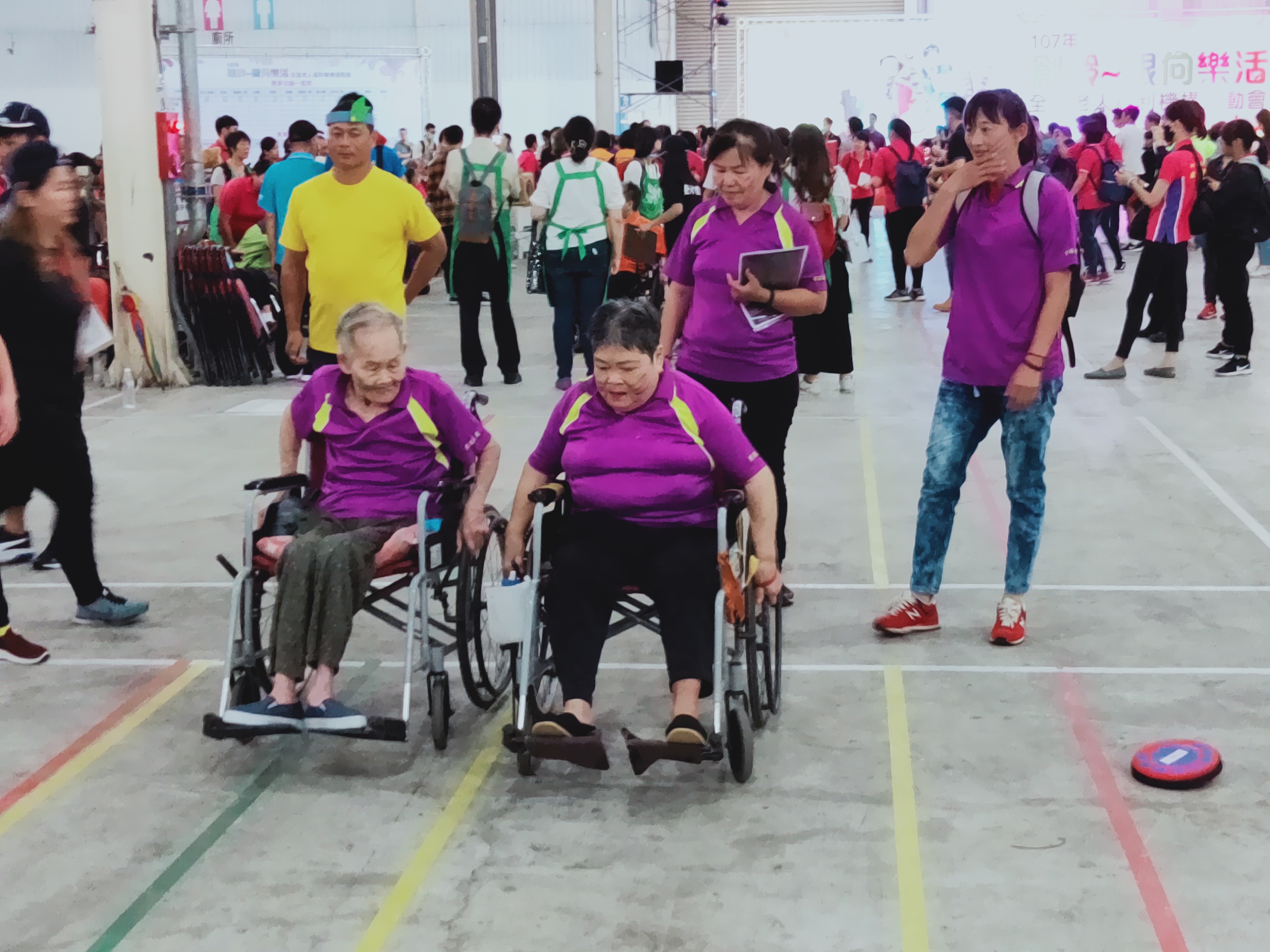 運動會正式開始,首先是躲避飛盤,由93歲的梁O足阿嬤及涂陳O珠阿嬤推輪椅,在框框中輪椅前進後退,馬力全開。進攻時是由林O豐阿公、陳O宗阿公、涂陳O珠阿嬤,可能是安排不恰當,O珠阿嬤雙手要丟出飛盤,有些吃重。再來是吹箭比賽,由劉O香阿嬤、陳O娟阿嬤、伍O花阿嬤領軍,成績平平。