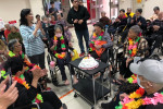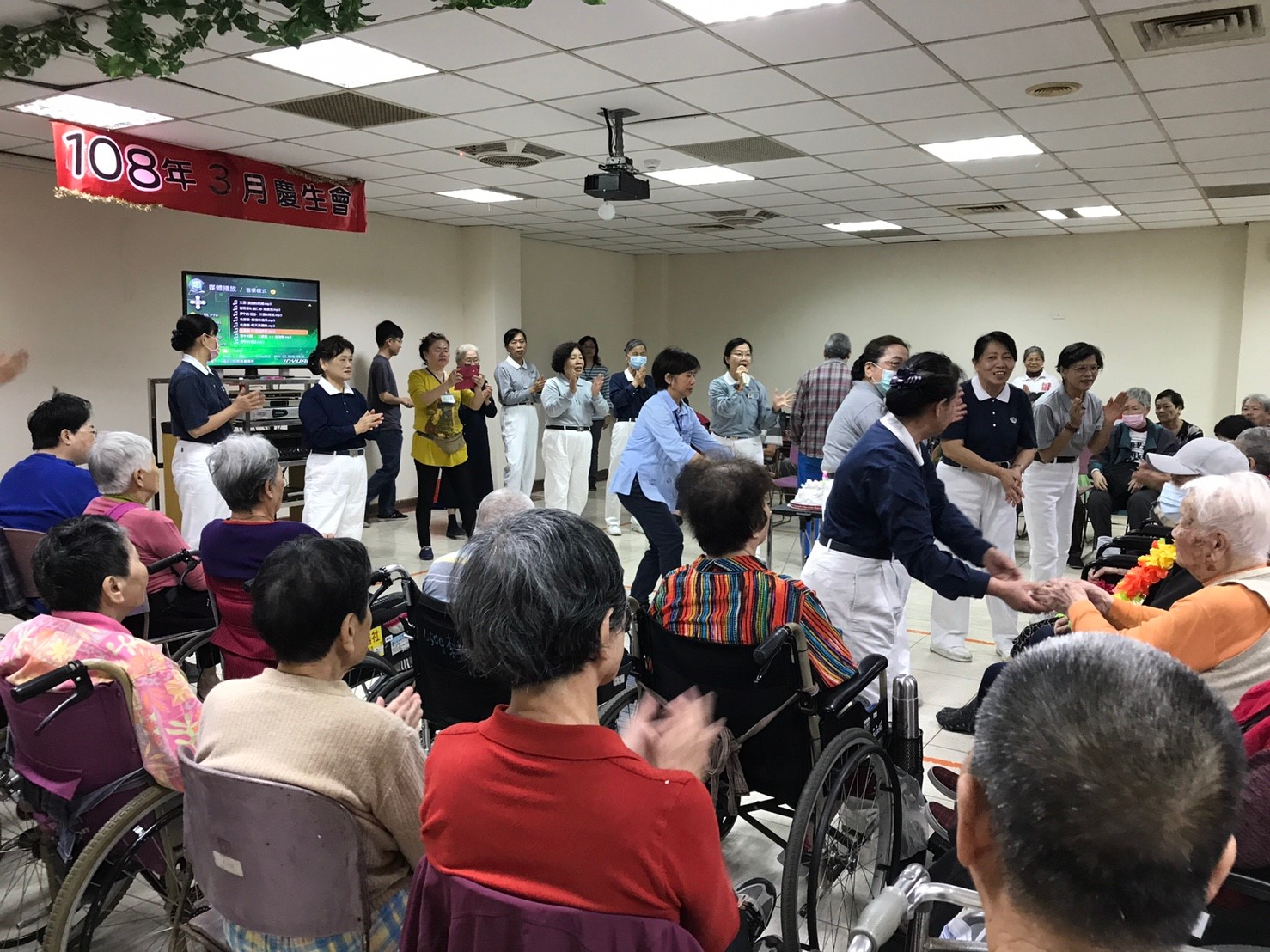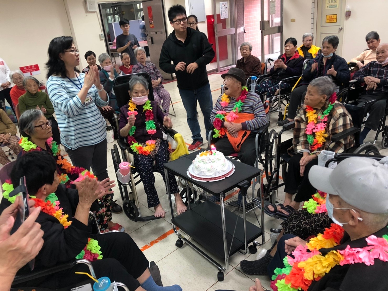 再來重頭戲就是「慶生會」活動,今天參與的壽星有張O、賴O、陳O線、曾O霞、吳O財、宋O牡、方O玉治等7位,由主任一一陪同切蛋糕留影以表祝賀。