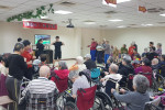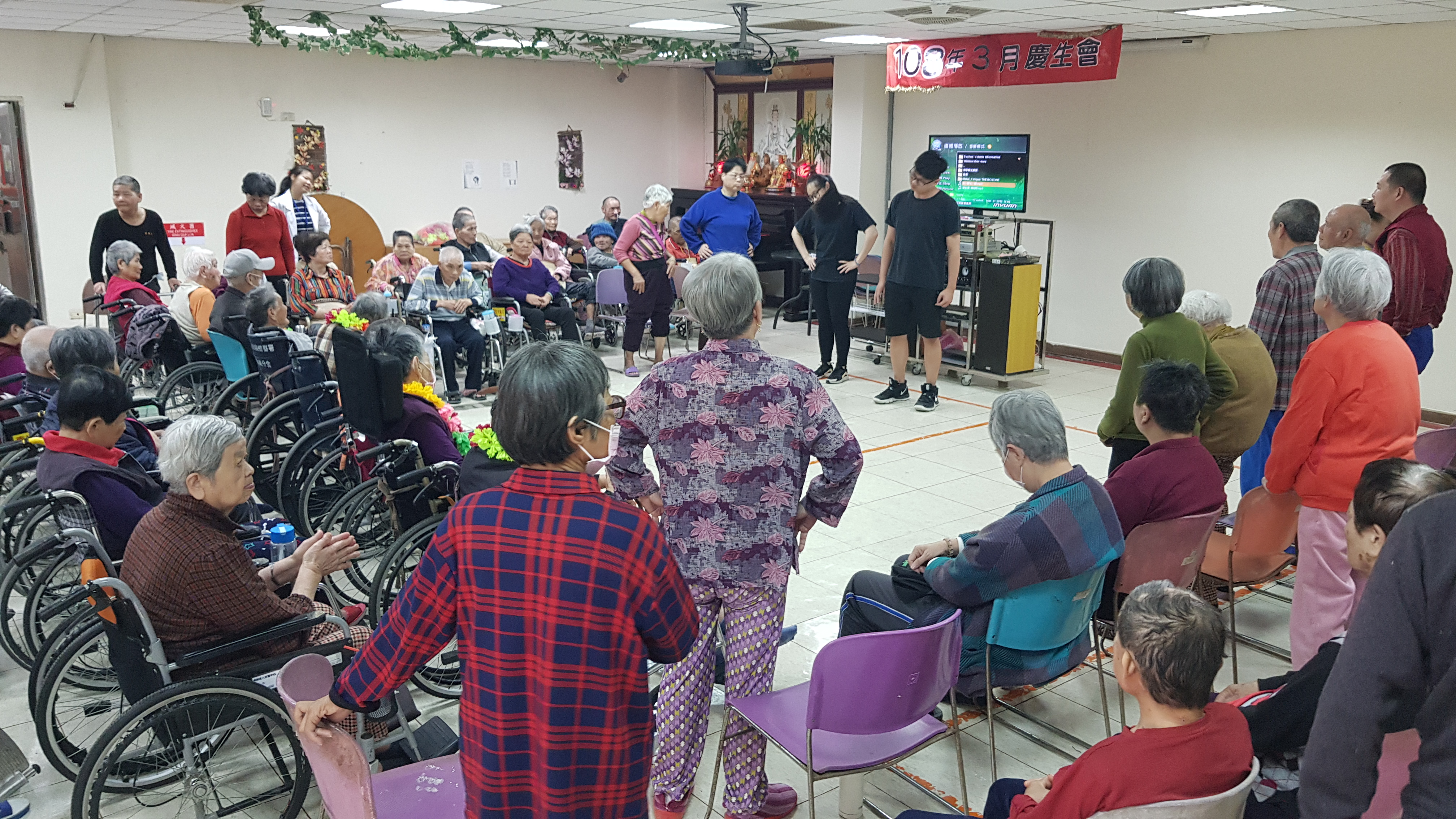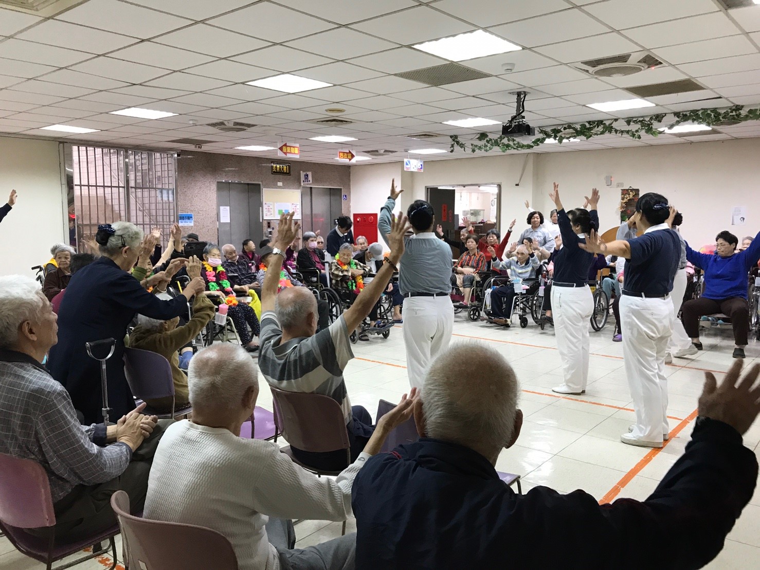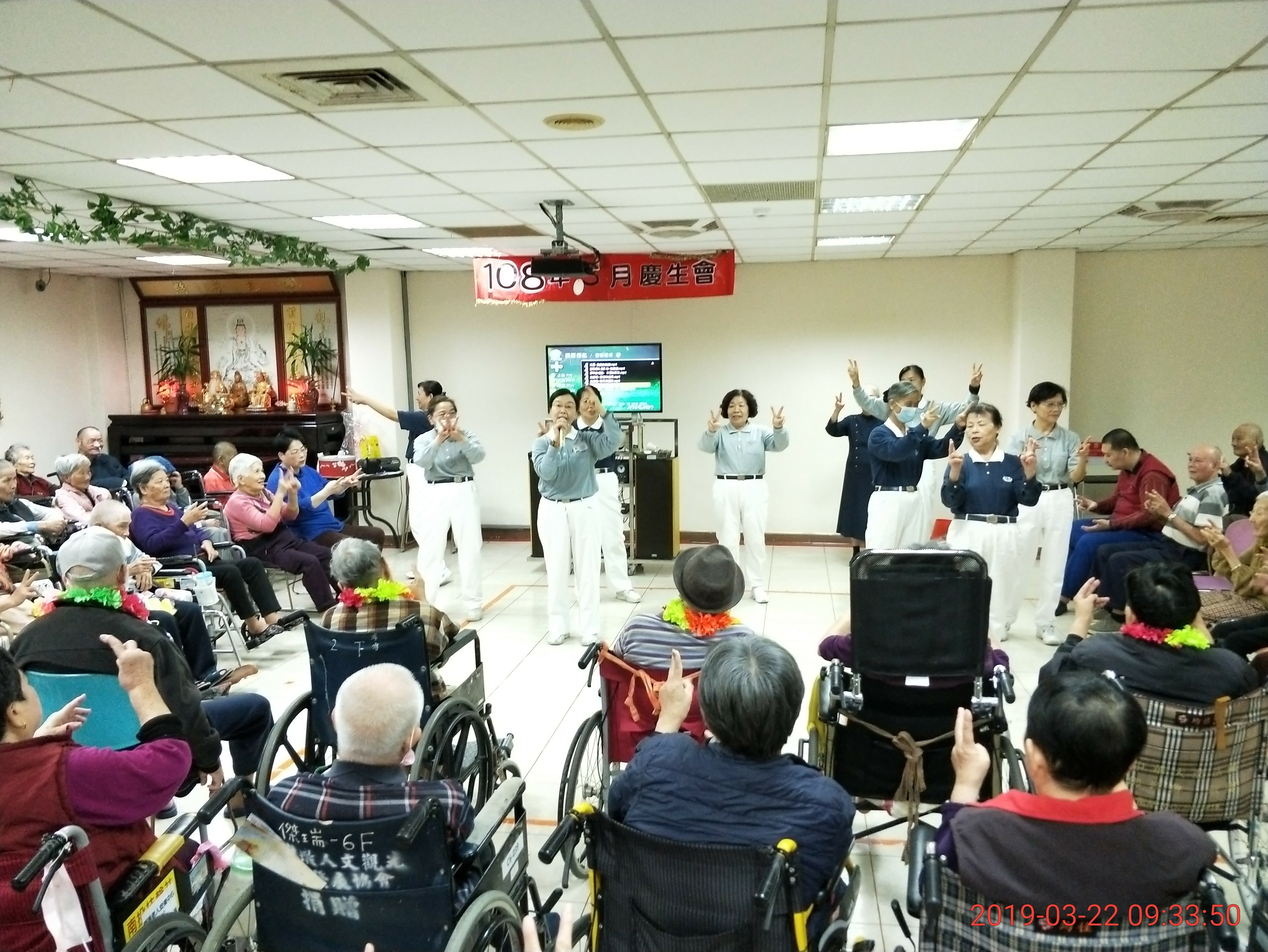 很高興今日有慈濟志工10餘名前來與長輩同樂,在停留一個小時間,師姐們帶來極豐富多元活動,包括手語歌、保齡球投準、傳海灘球、按摩、扇子舞表演。在傳海灘球過程中,當音樂停止時,接到球的長者需說一句好話,彩O阿嬤祝大家都健康;賴O阿公希望長壽綿延。整個活動在溫馨氣氛下結束。