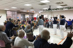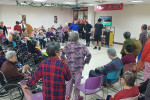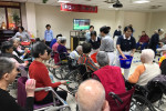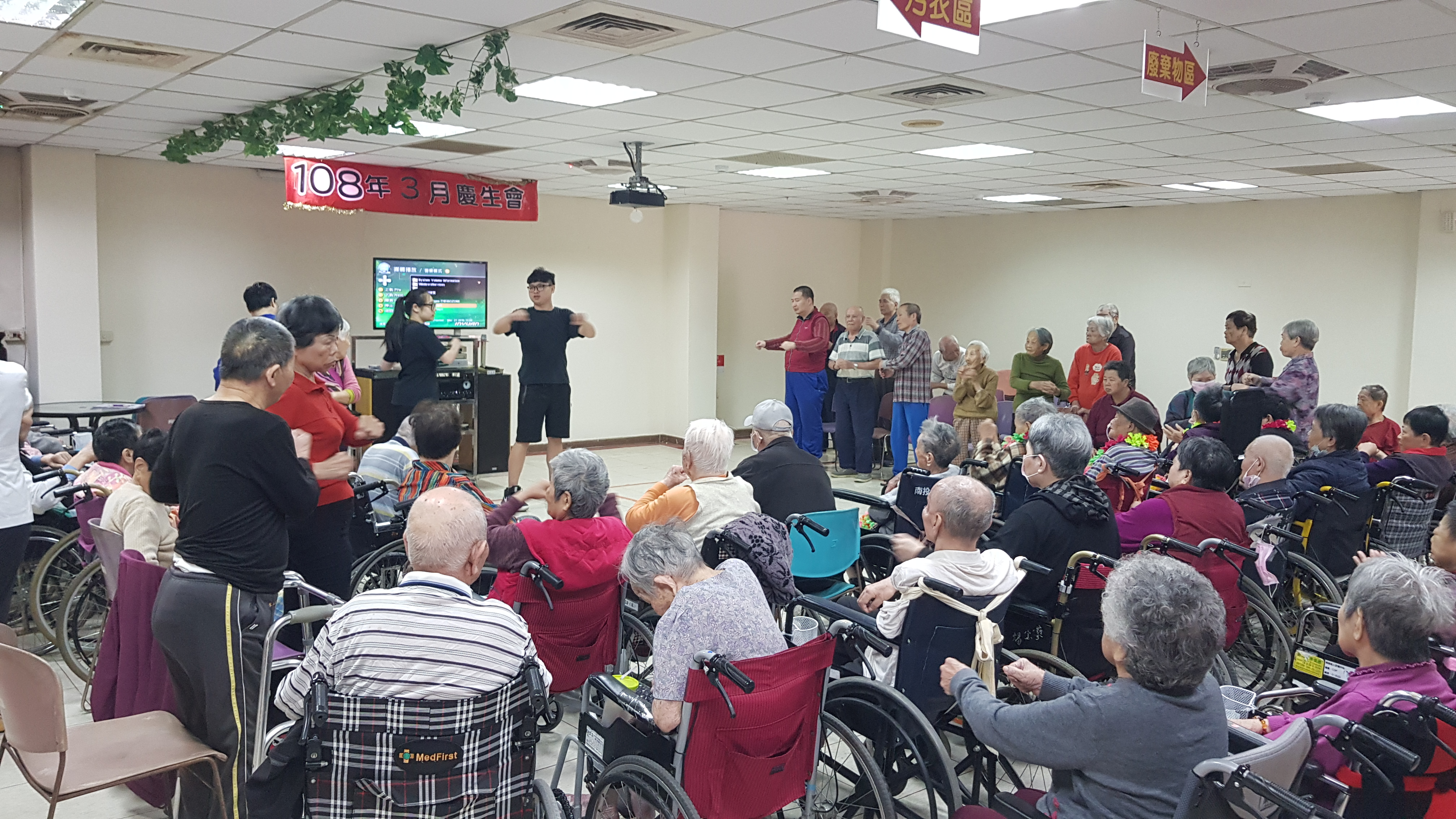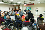 今日活動一開始,先由社工、2位實習生帶領約60位長輩一起動動四肢、肩膀、手指等暖和身體之活動後,開始有獎徵答,長輩對實習生精挑細選的音樂,當一放出來音樂旋律時,反應極快的舉手回答歌名,主持人也準備禮物送給答對題目的長者。
