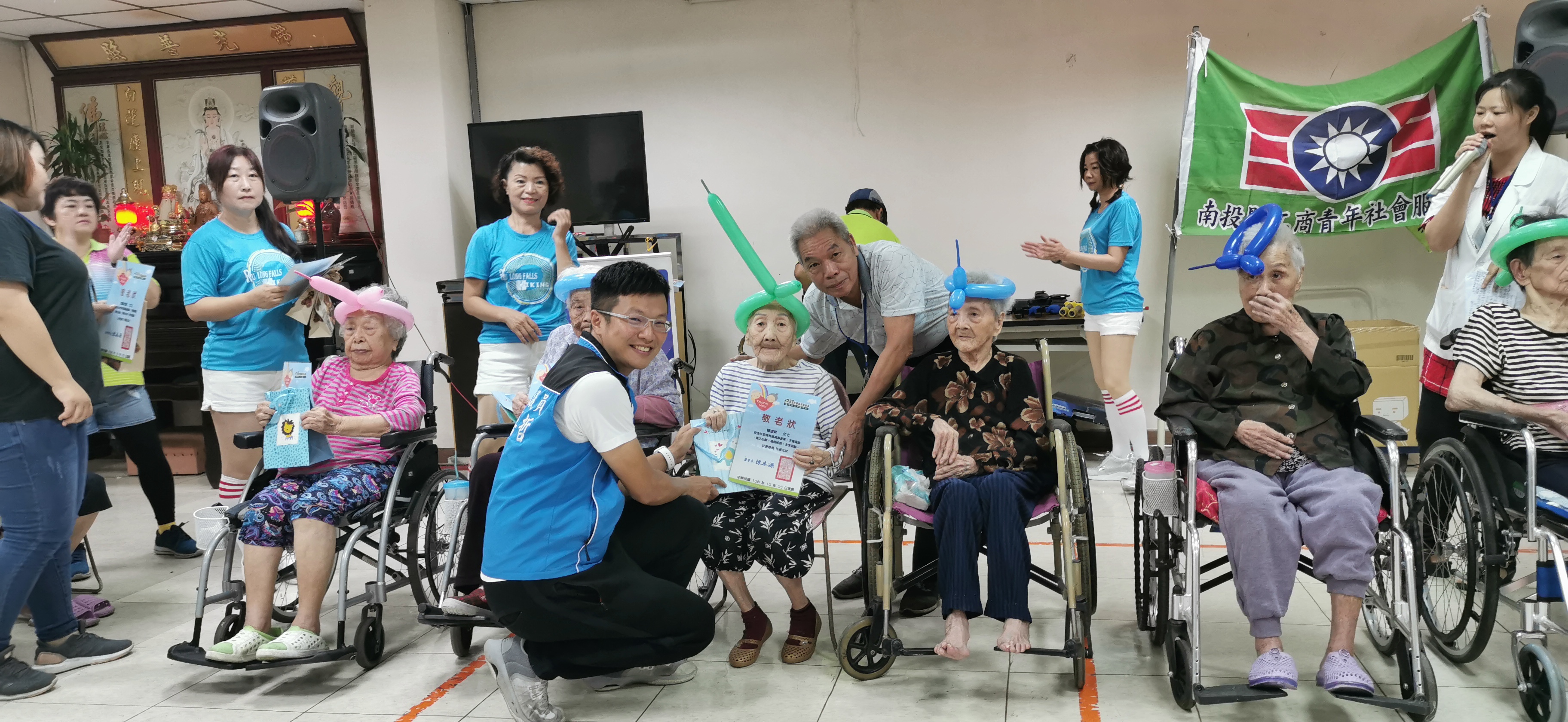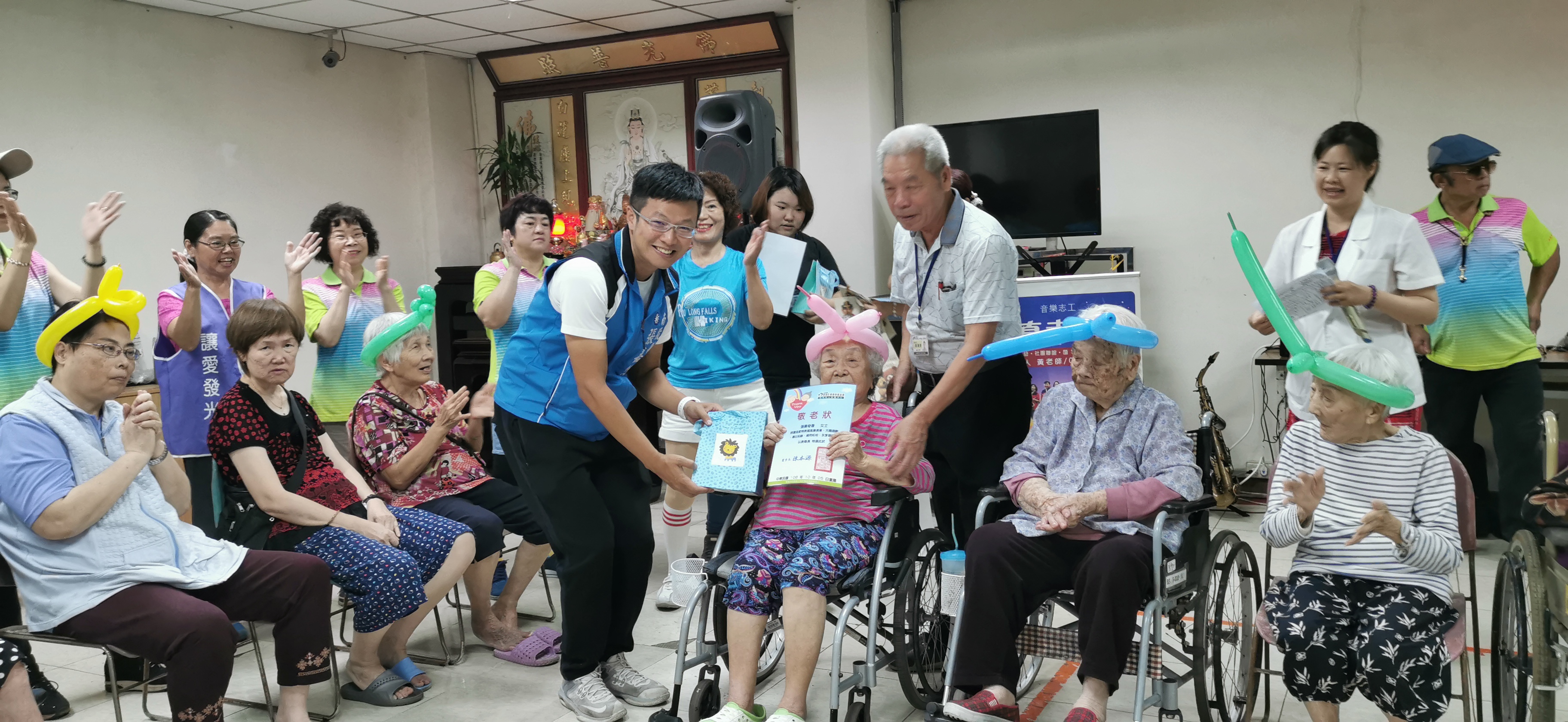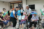 為祝福95歲以上長輩,邀請6位長輩上台,由張議員和楊副主任為6位長輩頒贈敬老狀和敬老禮物,以及贈送壽桃給中心所有的長輩們。中心也鼓勵家屬常常來探視長輩,今日由詠O阿嬤家屬代表,頒發孝悌狀和孝悌獎,以示鼓勵家屬經常探望長輩的孝心。詠O阿嬤家屬表示今年他也在台中市政府受邀下,獲得孝親表揚,他希望能讓自己的孩子擁有孝道的概念,從自己做起,未來孩子也能像自己一樣的孝順自己。