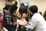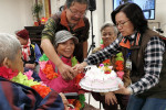 接下來是慶生會時間,工作人員協助將有戴花圈的壽星推來蛋糕前圍繞成一圈,再邀請音樂志工”老鬍鬚文哥”運用薩克斯風吹生日快樂歌,主持人邀請主任、組長及音樂志工共同為壽星切蛋糕及拍團體照,每位壽星都非常開心愉悅地享用蛋糕。